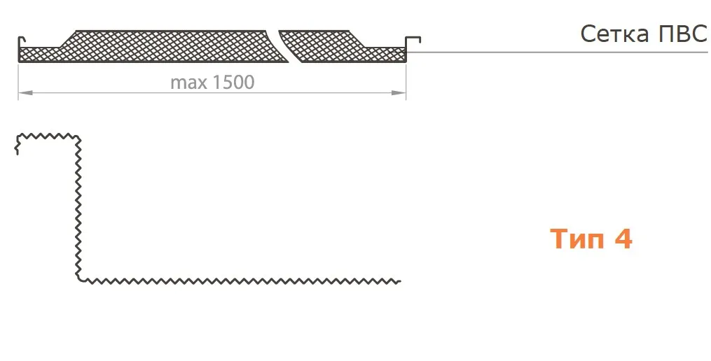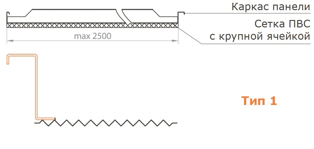 Панель HS с интегрированной сеткой ПВС снаружи панелиСетка ПВС с крупной ячейкой располагается на лицевой части панели и крепится точечной сваркой по периметру панели.Варианты используемой сетки: RB35, RB44, RB75 «чешуя», RB75A «ромб», Exa 05 «чешуя» и их производные. |