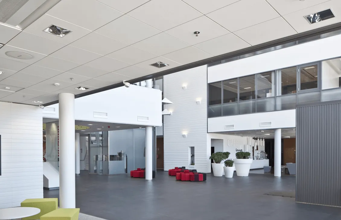 Потолочные панели Ecophon Фокус Дг имеют скрытые опорные кромки, благодаря чему они выглядят парящими в воздухе. Система предназначена для помещений, в которых уникальный дизайн потолочных панелей должен сочетаться с простотой их демонтажа.