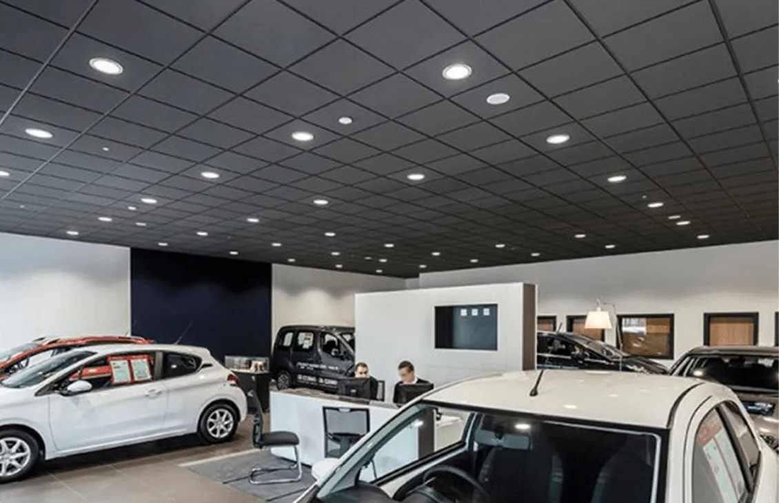 Минеральные потолочные панели Рокфон Индастриал Блэк с черной гладкой поверхностью обеспечивают акустику класса А и подходят для промышленных, офисных и жилых помещений.