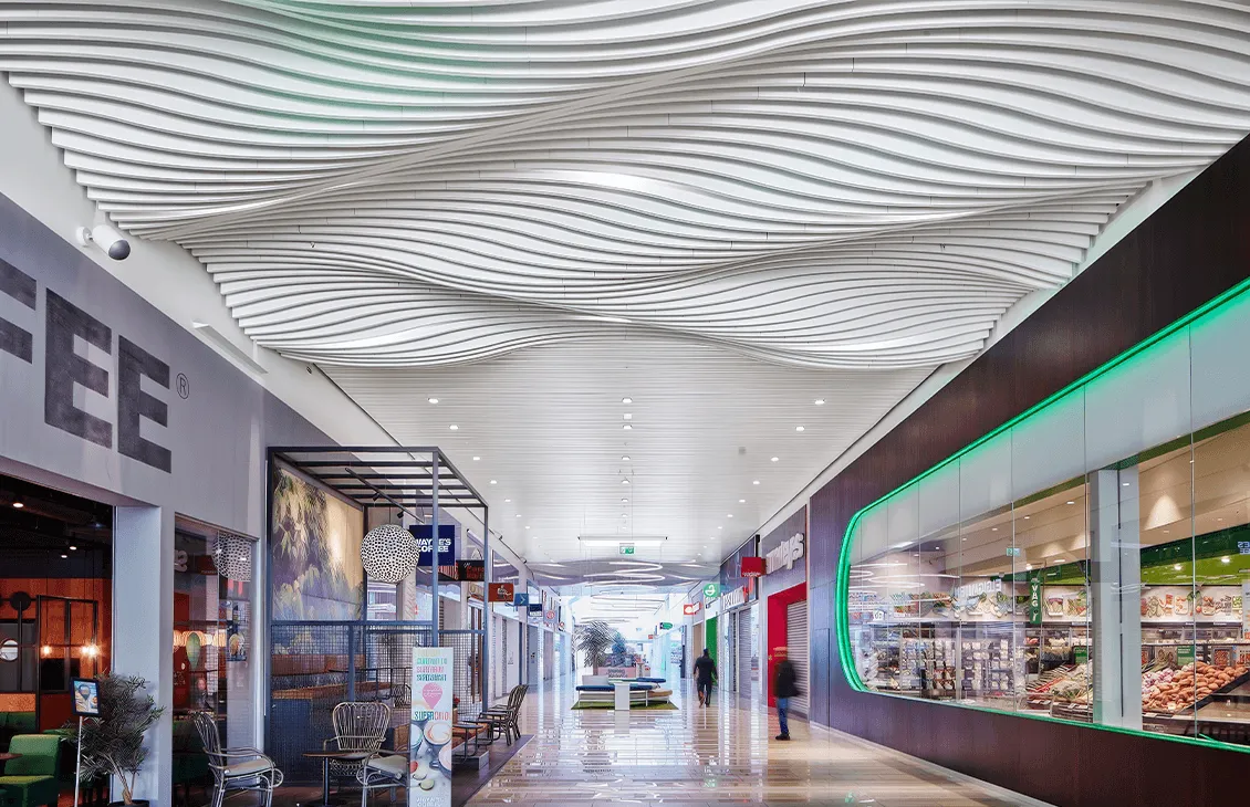 Ecophon Baffle Волна — это элегантное и функциональное решение для улучшения акустики и визуального оформления пространства. Эти свободновисящие акустические элементы без обрамления имеют уникальную волнообразную форму, предназначенную для создания мягких волн на потолке, что добавляет динамику и современный стиль интерьеру.