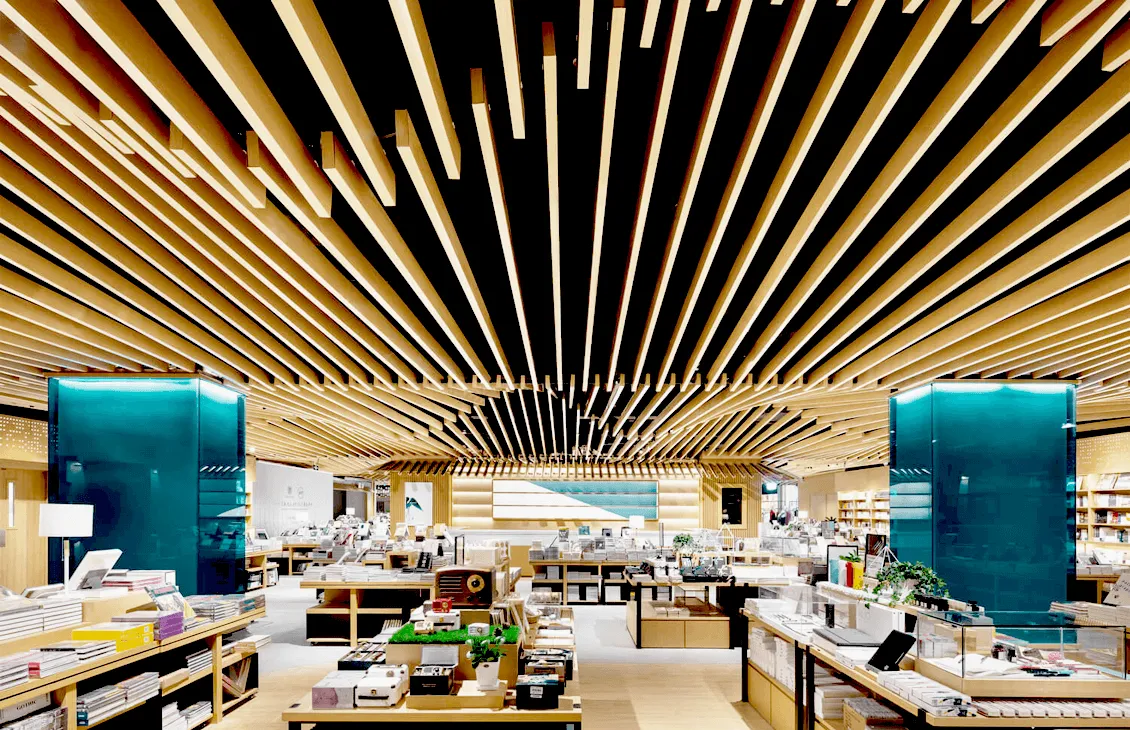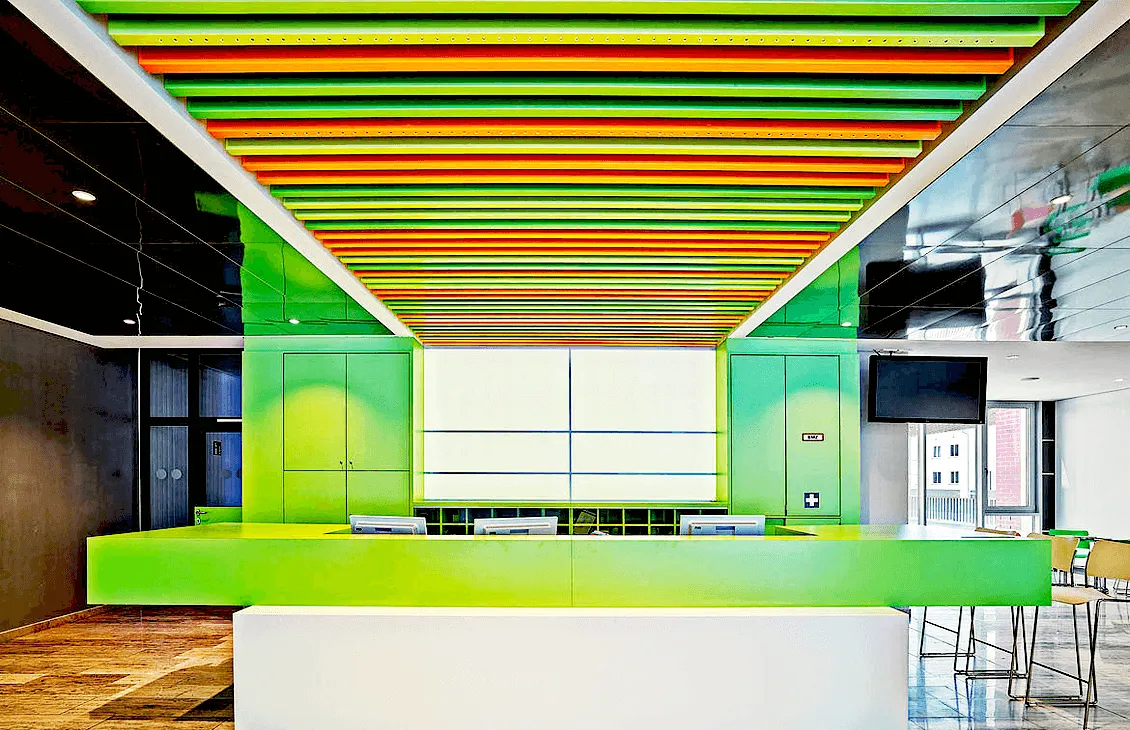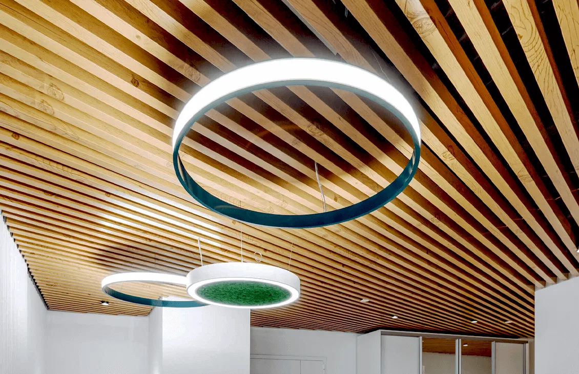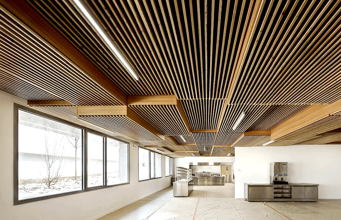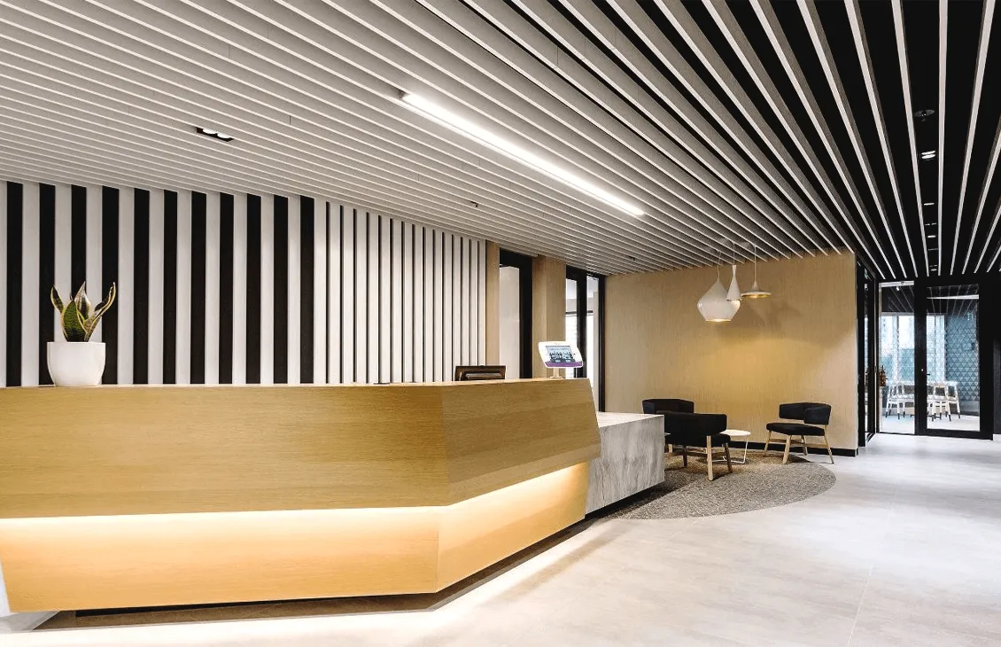 Кубообразный реечные потолок отличается своей геометрической строгостью и чёткостью линий, что делает его идеальным выбором для современных интерьеров. Благодаря возможности выбора любого цвета по шкале RAL, этот тип потолка легко адаптируется под цветовую палитру любого пространства.