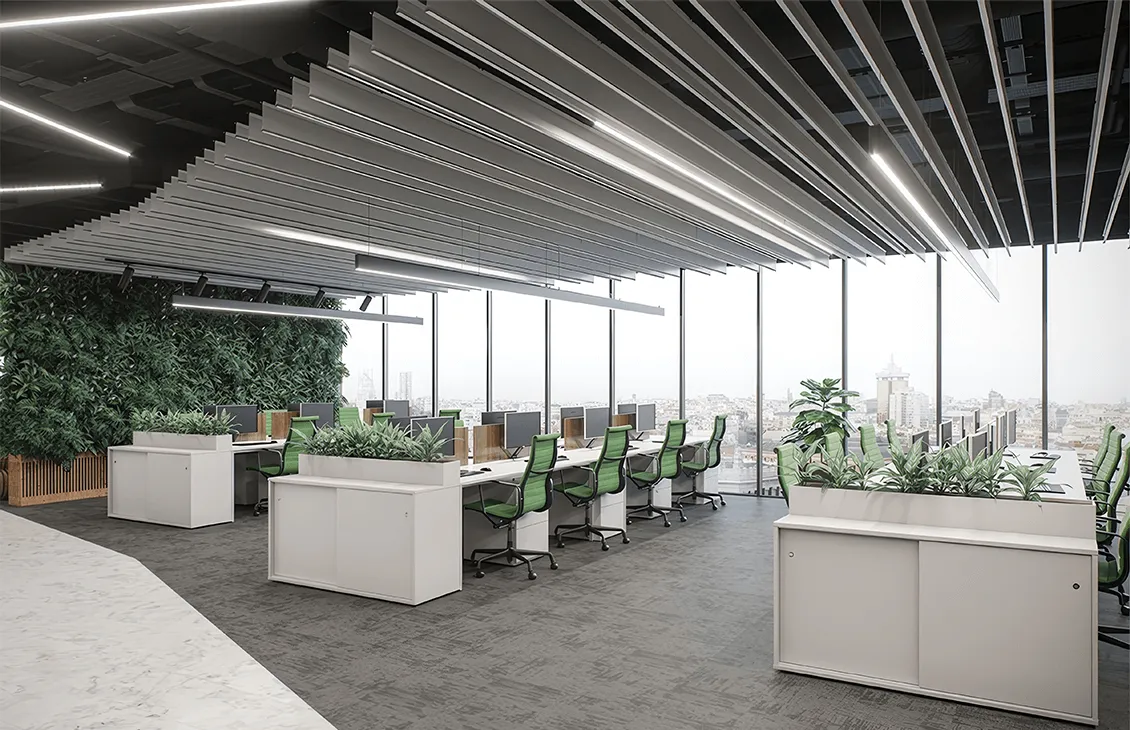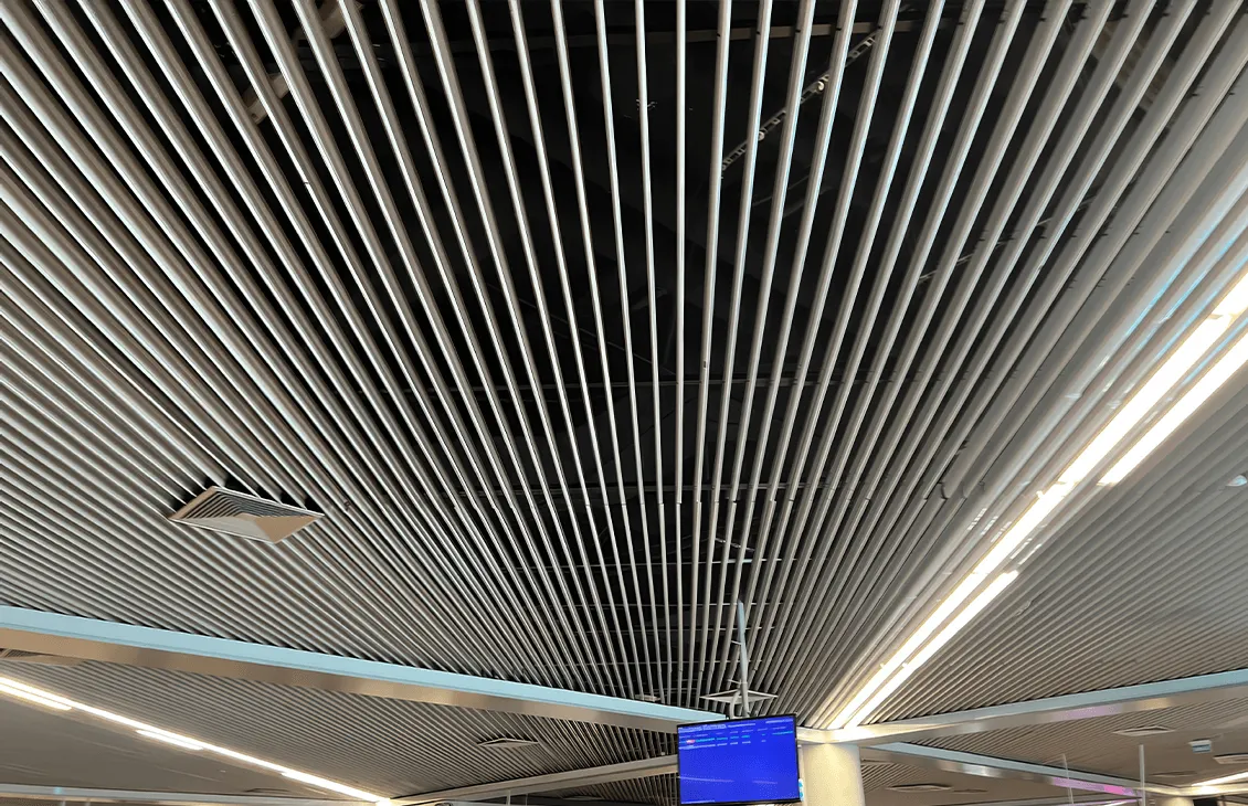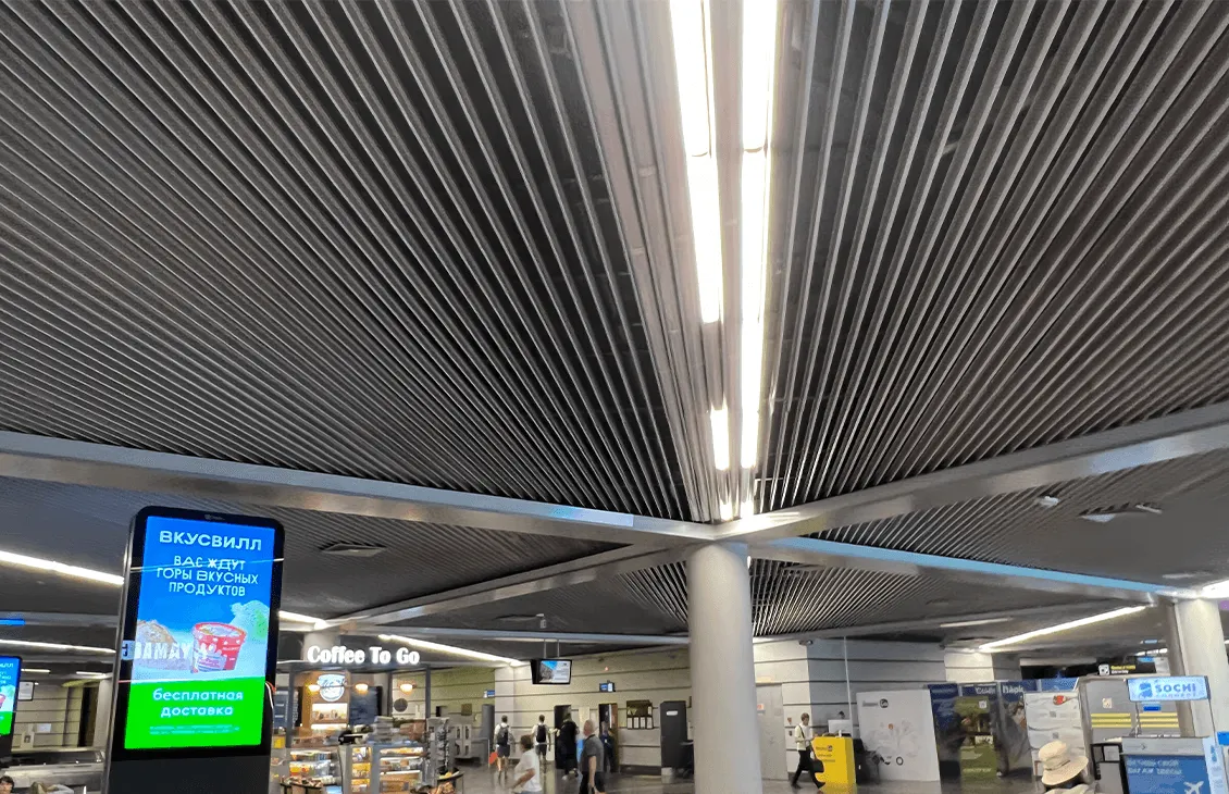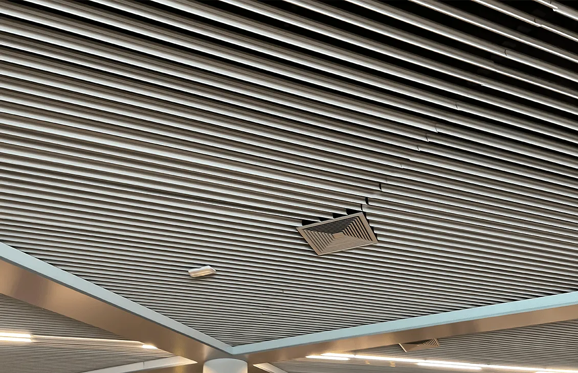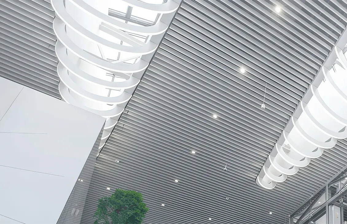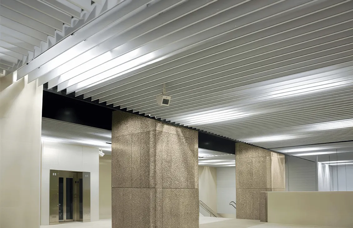 • Эстетическое превосходство: Потолки выполнены в форме пластин, что придает им элегантный и современный вид, а также создает визуальный объемный эффект, преобразуя интерьер.